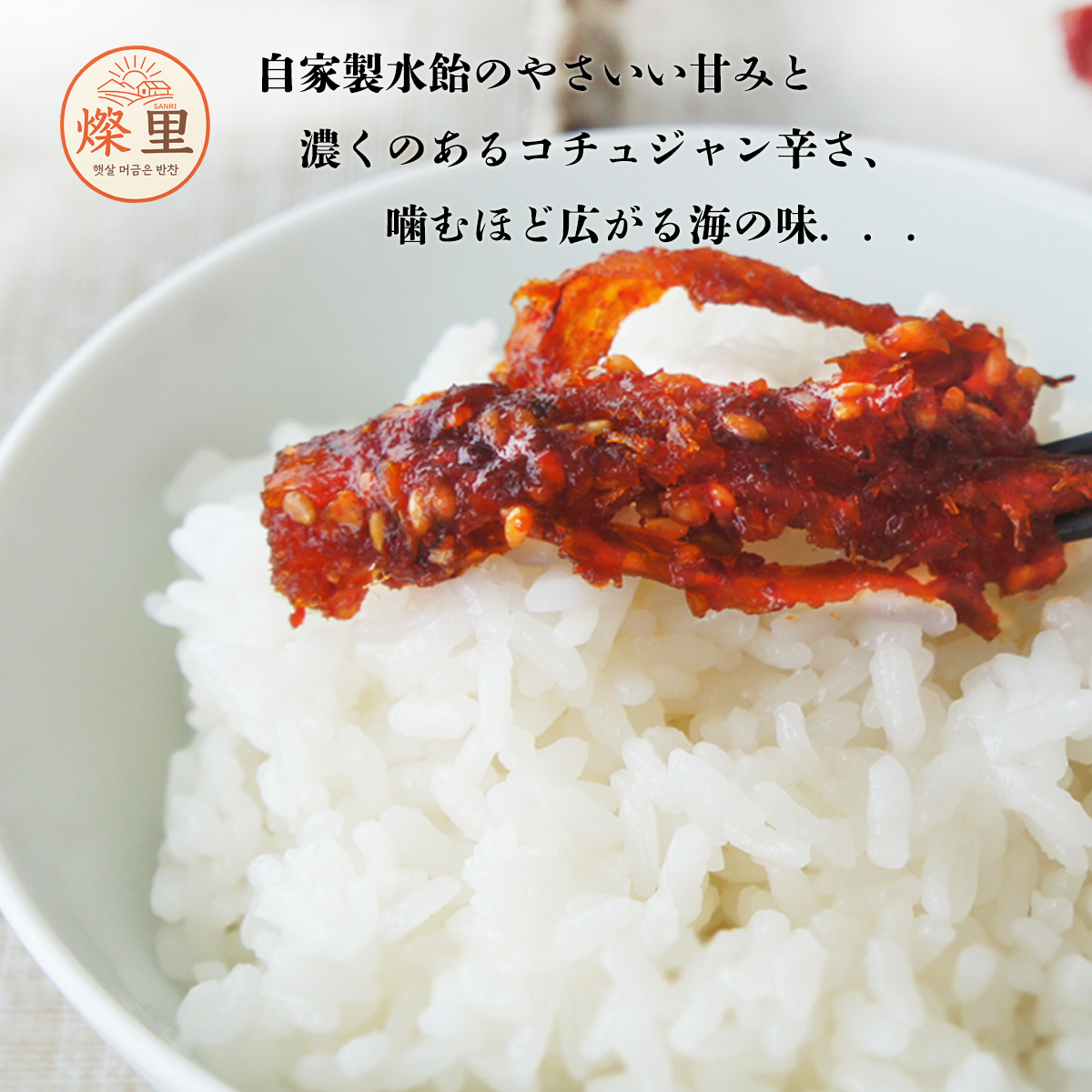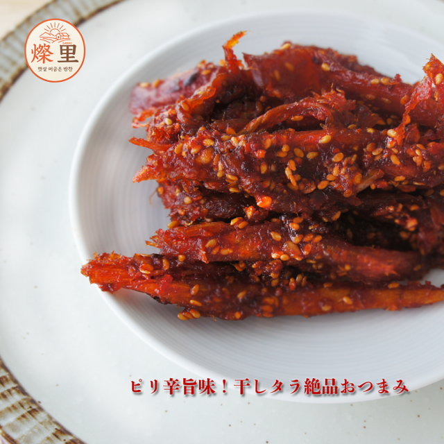 【燦里】珍味おかず\激辛!サキタラの和え物150g 自家製水飴のふんわり優しい甘みと、濃厚なコチュジャンのピリ辛が、干しタラの旨味と絶妙に絡み合う。 あたたかな味の里から家族を想う気持ち心を込めて手作りしています毎朝、家族を想う気持ちで新鮮な素材を丁寧に下ごしらえし、心を込めて手作りしています。一口で広がるやさしい味わい