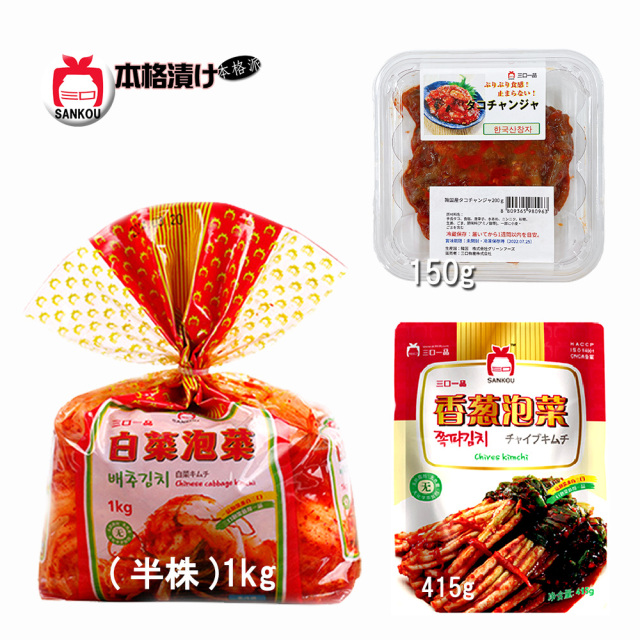 | 原材料 | 【白菜キムチ1kg:白菜、大根、唐辛子、大蒜、魚醤油(アンチョビ、食塩)、葱、玉葱、食塩、林檎エキス(リンゴ、ビタミンC)、韮、生姜、調味料(アミノ酸等)】【ねぎキムチ415g: 小葱、漬け原材料(唐辛子、大蒜、魚醤油(アンチョビ、食塩) 、生姜、大葱、食塩、海老、調味料(アミノ酸等)】【韓国産たこチャンジャ150g:手長たこ、食塩、唐辛子、水あめ、ニンニク、砂糖、生姜、ごま/調味料(アミノ酸等)、(一部に小麦・ごまを含む)】 |